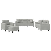 Cet ensemble de canapés est un excellent endroit pour discuter, lire, regarder la télévision ou simplement vous détendre. Il est destiné à être un point central de votre maison. Microfibre résistant : le microfibre est un tissu synthétique composé de fibres ultra-fines, particulièrement résistantes aux taches. Le tissu en microfibre est un excellent choix pour le rembourrage des meubles en raison de sa durabilité et de son nettoyage facile.Structure robuste et stable : la structure en contreplaqué et en métal du canapé assure robustesse et stabilité.Expérience d'assise confortable : le canapé est très confortable avec le siège, les accoudoirs et les oreillers de dossier bien rembourrés.Oreillers de canapé pratiques : ces oreillers décoratifs carrés non seulement embellissent votre décor mais ils peuvent également apporter un confort supplémentaire lorsque vous êtes assis ou allongé.Pouf polyvalent : ce repose-pied convient pour reposer vos pieds lorsque vous êtes allongé dans un canapé, ou pour vous offrir un siège supplémentaire dans votre pièce. De plus, le design simple et la taille compacte le rendent idéal pour presque tous vos espaces de vie.