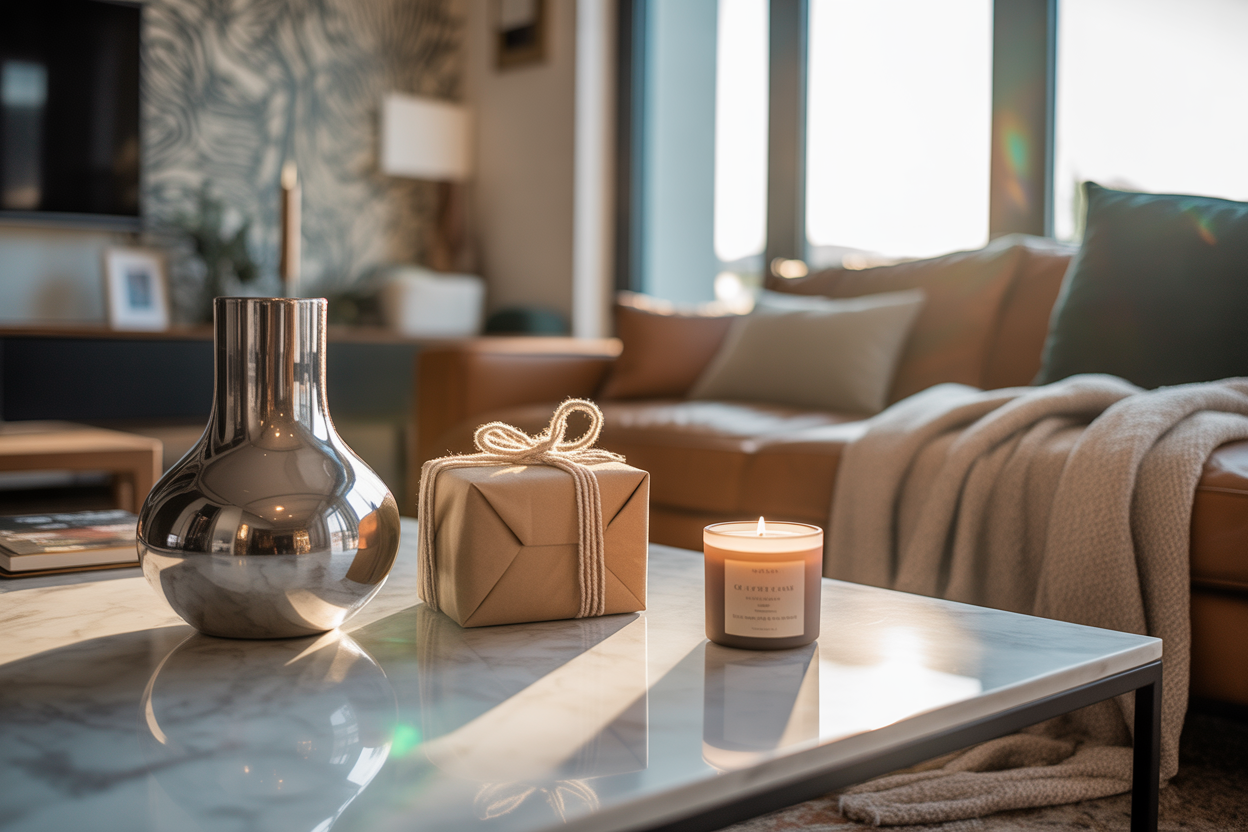 Ou un coffret "design" avec un petit objet chromé, un poster graphique et une plante dans un joli pot. Cette approche montre un effort de curation et une réelle réflexion, ce qui rend le cadeau d'autant plus précieux.
