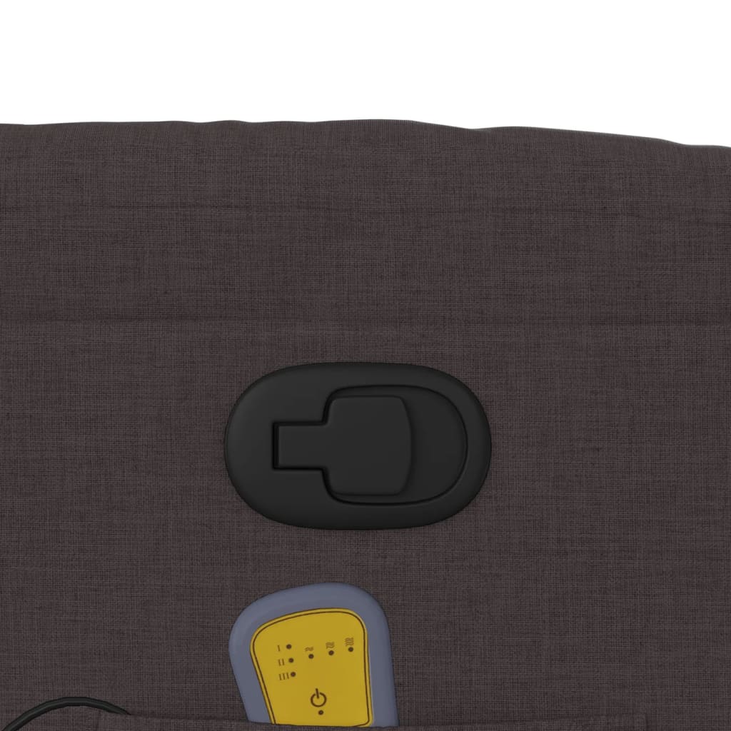 Asseyez-vous et détendez-vous dans ce fauteuil inclinable de massage très confortable ! Fonction d'inclinaison manuelle : ce fauteuil inclinable est doté d'une poignée du côté droit. Vous pouvez régler manuellement le repose-pieds et le dossier dans n'importe quelle position selon votre confort en tirant simplement sur la poignée. Cette fonction permet une inclinaison maximale de 135 degrés. De plus, le dossier peut revenir rapidement à sa position d'origine en tirant simplement sur la poignée.Fonction de vibration : les 6 points de massage vous permettent de faire l'expérience d'un massage mieux ciblé. De plus, la télécommande incluse vous permet de choisir différents programmes de massage. La fonction de massage est alimentée par le connecteur USB, mais la source d'alimentation USB 5V certifiée n'est pas incluse.Expérience d'assise confortable : le siège, le dossier et les larges accoudoirs bien rembourrés recouverts de tissu procurent une sensation confortable et chaleureuse, vous permettant de vous sentir enveloppé lorsque vous êtes assis. Le tissu présente un aspect simple et épuré et est respirant et durable.Porte-gobelets et poche latérale pratiques : ce fauteuil dispose de deux porte-gobelets pratiques pour vos boissons et d'une poche latérale pour votre télécommande ou pour garder vos objets essentiels à portée de main.Cadre solide et stable : le cadre en bois et en métal offre une structure solide et une grande stabilité. Ce fauteuil inclinable est confortable et durable.