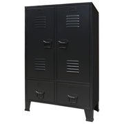 Notre garde-robe de style industriel offre suffisamment d'espace de rangement pour ranger vos vêtements, chapeaux et accessoires de façon ordonnée. Robuste et stable : le cadre en acier impressionne par sa solidité, sa durabilité et sa résistance à la corrosion, ce qui en fait un choix idéal pour diverses applications, y compris la fabrication et la construction de meubles.Grand espace de rangement : l'armoire dispose de 2 étagères intérieures réglables qui vous permettent de classer soigneusement vos vêtements dans différentes catégories et de 2 tiroirs pour ranger et classer vos chaussettes, sous-vêtements etc.Surface facile à nettoyer : la garde-robe est facile à nettoyer avec un chiffon humide.Style industriel : chaque porte a un support de bristol et des trous de ventilation pour ajouter à son aspect de vestiaire industriel. Attention :Pour éviter qu'il ne bascule, ce produit doit être utilisé avec le dispositif de fixation murale fourni.