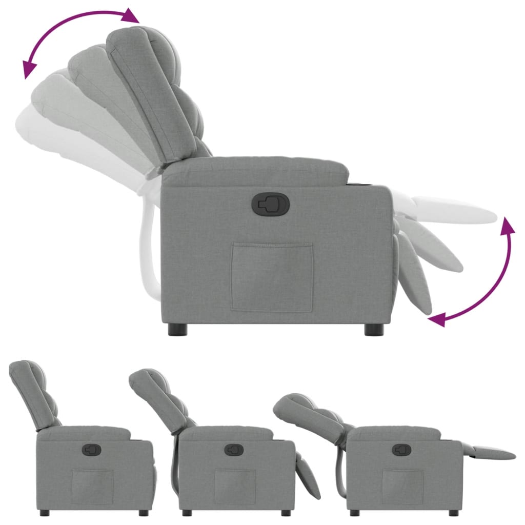 Asseyez-vous et détendez-vous dans ce fauteuil inclinable très confortable ! Fonction d'inclinaison manuelle : ce fauteuil inclinable est doté d'une poignée du côté droit. Vous pouvez régler manuellement le repose-pieds et le dossier dans n'importe quelle position selon votre confort en tirant simplement sur la poignée. Cette fonction permet une inclinaison maximale de 135 degrés. De plus, le dossier peut revenir rapidement à sa position d'origine en tirant simplement sur la poignée.Expérience d'assise confortable : le siège, le dossier et les larges accoudoirs bien rembourrés recouverts de tissu procurent une sensation confortable et chaleureuse, vous permettant de vous sentir enveloppé lorsque vous êtes assis. Le tissu présente un aspect simple et épuré et est respirant et durable.Porte-gobelets et poche latérale pratiques : ce fauteuil dispose de deux porte-gobelets pratiques pour vos boissons et d'une poche latérale pour garder vos objets essentiels à portée de main.Cadre solide et stable : le cadre en bois et en métal offre une structure solide et une grande stabilité. Ce fauteuil inclinable est confortable et durable.